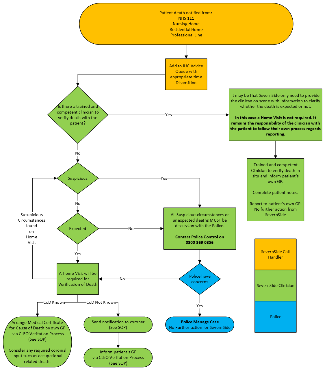 Severnside clinicians will continue to discuss community deaths with paramedics and other healthcare professionals to help with decision-making around expected vs unexpected deaths, but responsibility for verification of death lies with a trained and competent person, who is physically present with the deceased.